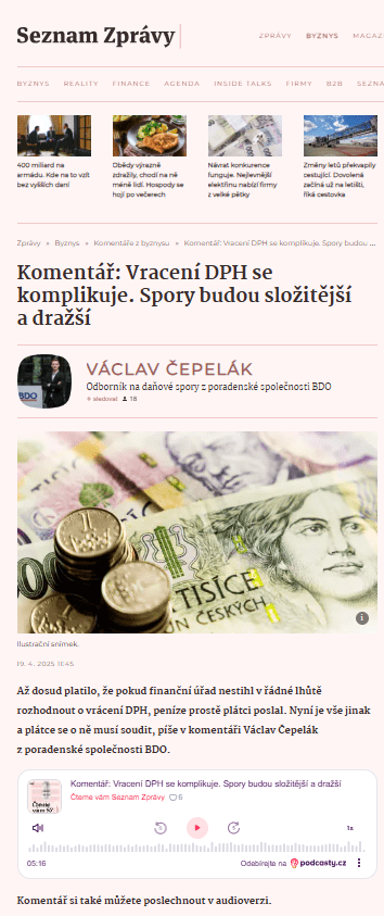 - Daří se nám rozšiřovat spektrum služeb, ve spojitosti se kterými je BDO v médiích vidět. Například aktualitu týkající se zavádění uhlíkového cla (CBAM) z ranku environmetální udržitelnosti firem jsme navrhli k mediální komunikaci a následně se nám ji podařilo medializovat například ve Forbesu, na titulní straně Hospodářských novin nebo na iDnes.cz a Mf Dnes. Díky naší aktivitě se navíc BDO stalo jedinou společností, která tuto aktualitu do médií přinesla.