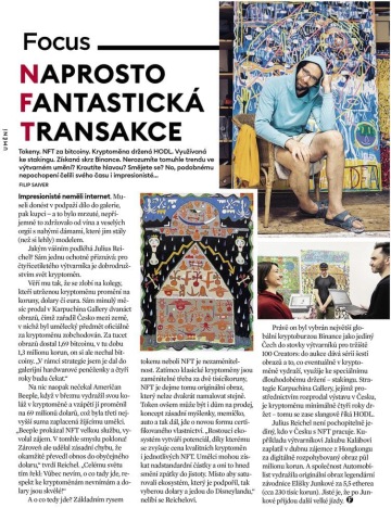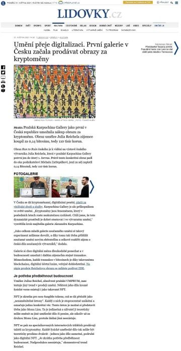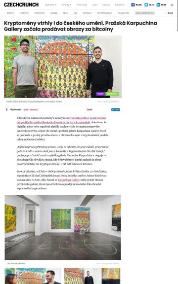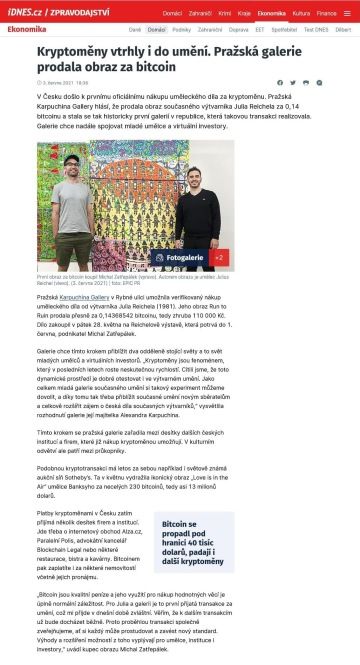 Pražská Karpuchina Gallery se po epidemii COVID otevřela návštěvníkům. Protože jde o mladou galerii (byla otevřena v roce 2020), potřebovala zaujmout veřejnost neotřelým konceptem. Spojila se proto se svébytným umělcem Juliem Reichelem, který patří mezi zavedené postavy českévýtvarné scény a také kryptokomunity, a vytvořila pro zájemce příležitost koupit jeho obrazy za bitcoin.