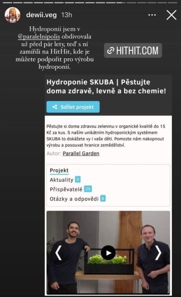 - Úspěšně jsme navázali barterovou spolupráci s influencery – Kateřina Saint Germain (240 tis. sledujících), Jiří Burýšek (210 tis. sledujících, bistro Etapa (30 tis. sledujících) a Flowee (8 tis. sledujících) a ambasadorka Dewii, kteří podpořili hithitovou kampaň celkem 21 příspěvky, a zvýšili tak počet sledujících profilů Parallel Garden na sociálních sítích i návštěvnost stránky s kampaní a prodej SKUBy a dalších nabízených odměn.